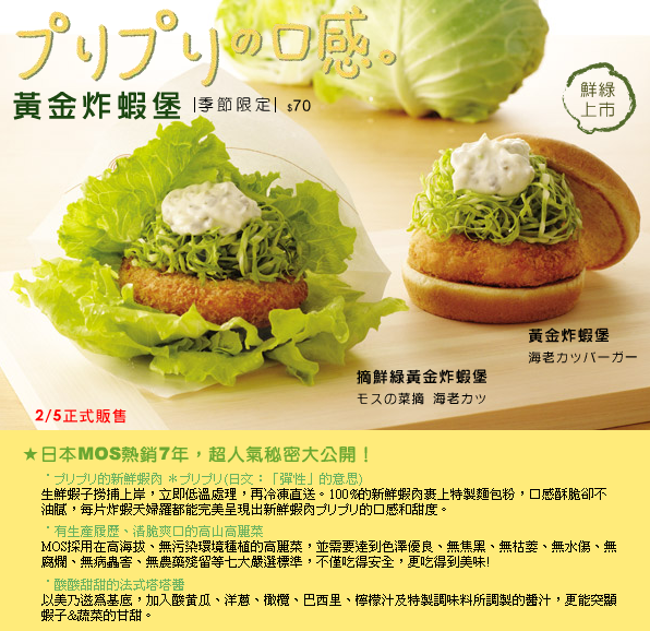 掛病號在家休養,難得可以睡到10點多,起床的時候家裏已經沒啥吃的了,我尪(對,沒錯,我在家休養,他也陪我在家XD)我是人不是仙~病歸病,肚子餓了該吃的還是要吃,沒有好體力,哪有好精神跟病魔對抗咧!既然問我要吃啥?想了想,我想吃MOS的「摘鮮綠黃金炸蝦堡」,之前看到DM的介紹就很想試試;二話不話拿了電話先選好餐點後,就派老公騎著兩輪車出發啦~(MOS可用電話先點餐,省去排隊的時間唷,真貼心!)