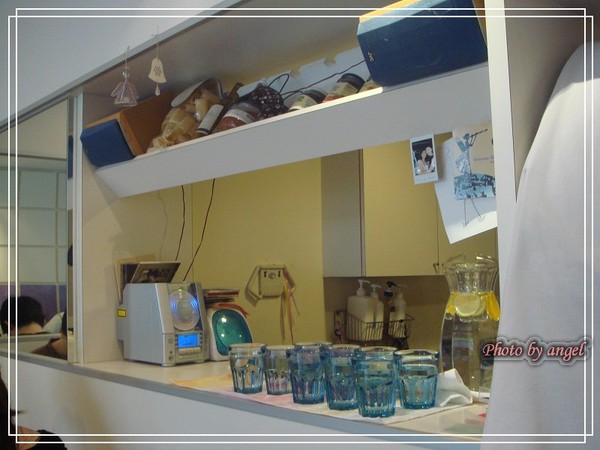 開放式的櫃檯,廚房的空間一覽無遺~呵~我記得上星期三打電話去和Anais預約的時候,她先請我們要有心理準備,做菜、招待、服務都只有她一人,上菜時間會有點慢,請帶耐心來用餐。所以~在這裏我們可以很隨性的自己來,果汁、開水無限續杯,食用完的杯盤請自動收到櫃檯;另外,餐點的份量不少,請留肚子給她,吃不完請帶便當盒來打包...啪拉啪啦啪拉的說了一堆,我則是拼命的說,好、是、我記住了,和Anais小聊了一下,覺得挺有趣的,這麼隨性的老闆娘,不多見了吧^^~