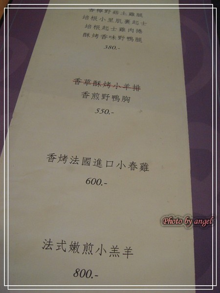 那天除了聖狗腿軍團五人眾(笑狗腿、傲狗腿、邪太后、夜影、我)之外,另有11人客,把小小的餐館都擠滿了(生意真好),Anais在大家點餐前,會先仔細的為餐點做講解,進做法都會告知,大家都很認真的聽著她介紹,心裏都有個底。除了MENU上的套餐,另有一種是Anais自己發明的「隨便煮」NT$500,就是看今天的配菜有什麼煮什麼。一番討論之後,我們點了「法式嫩煎小羔羊」「培根起士雞肉捲」「香烤法國進口小春雞」和一份「隨便煮」!