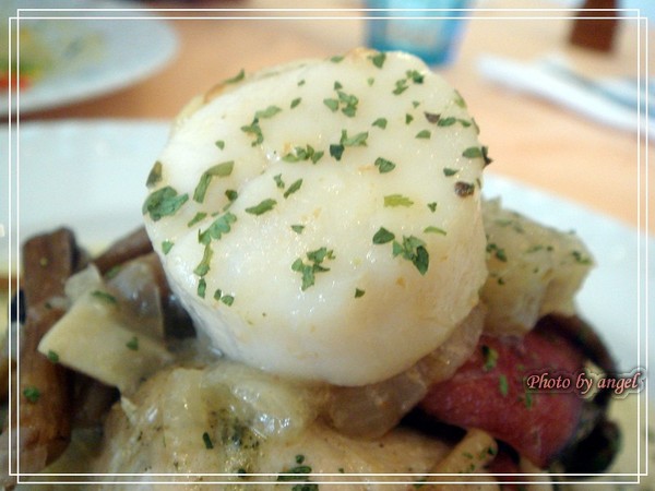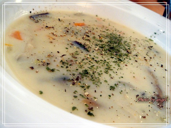 《香芋野菇濃湯》原先我一直以為會上蕃茄濃湯,不過因為夏天的關係Anais覺得白湯比較清爽,也是啦。整片的菇類就浮在上頭,撒上了滿滿的香草,喝上一口,就是料多實在的不像話!