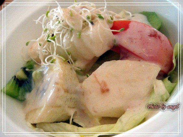 《優格沙拉》這裏的沙拉有紅酒醋和優格醬兩種,不吃酸所以我選了優格,Anais的優格醬是加了特製的玫瑰蜜,吃起來不會有一般優格醬的奶酸味,我吃了整個就是大喜,沙拉也很棒,都是時令水果,還有一種很有趣的叫「豆薯」的食材,我不確定它是算水果還是蔬菜,總之,吃起來的口感像水梨,很爽口!
