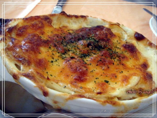 《前菜:焗馬鈴薯》這道大家吃了都讚不絕口,做法也超簡單,就是馬鈴薯薄片約0.2mm後,加上蒜泥撒上海鹽調味,再覆上起士,夠簡單了吧;重點是,我從來不覺得薄片的馬鈴薯可以這麼美味!