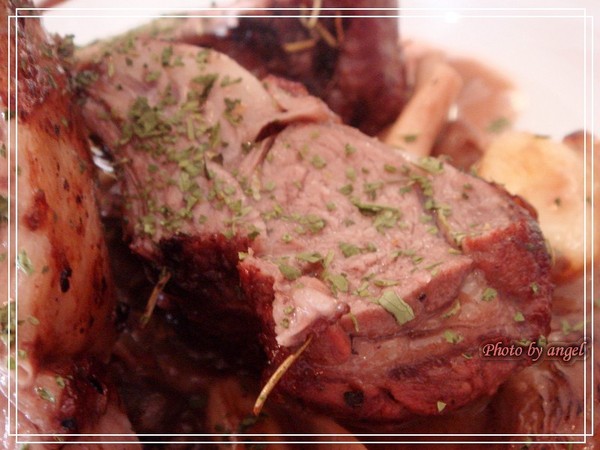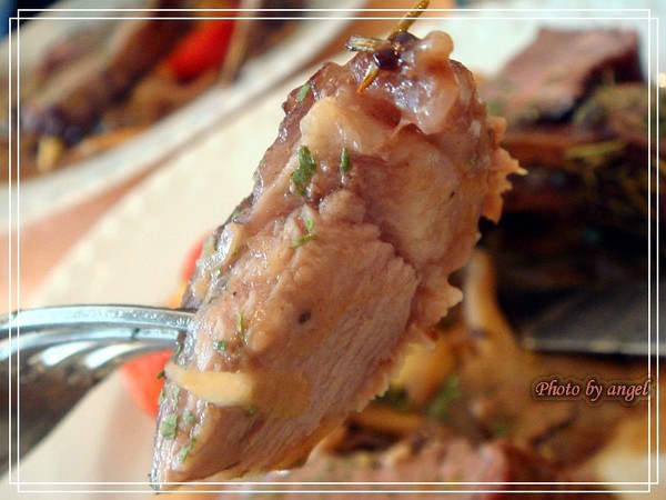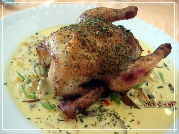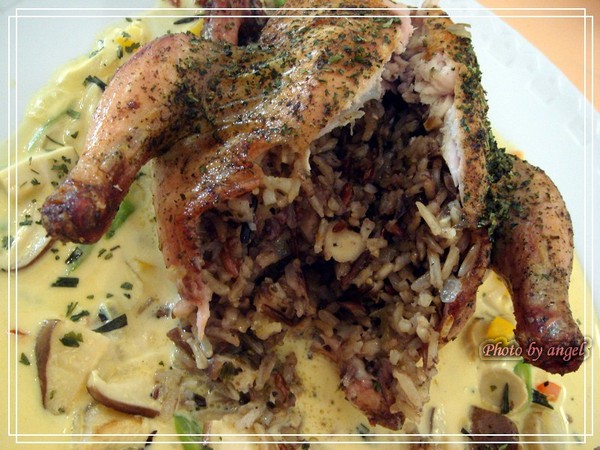 春雞不只是春雞而已哦,整隻小春雞裏頭還塞了長碾米,送上來的時候不覺得,一切開,My~God~香氣四溢,當時的情況是切開後,大家輪流對著春雞聞XDDDD,因為實在太香了!搭配時蔬燉煮的黃色醬汁,吃的是傲狗腿連軟骨都不放過,照樣切來啃XD
