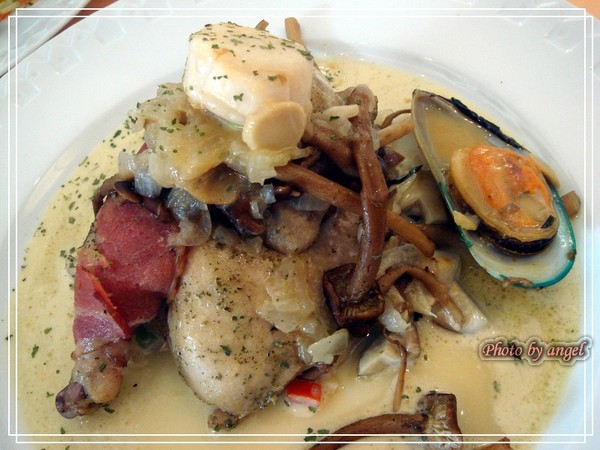 《隨便煮》就是半隻小春雞,小腿裹上培根、一顆大干貝、一顆淡菜和香菇~說是隨便煮,可一點也不馬虎!