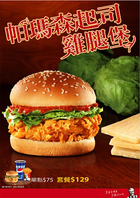嗯,我有好一段時間沒吃肯德基了,要吃什麼呢?上網看看有什麼~~哈,想到最近KFC的電視廣告介紹新產品「帕瑪森起司雞腿堡」,好,就是它了!
